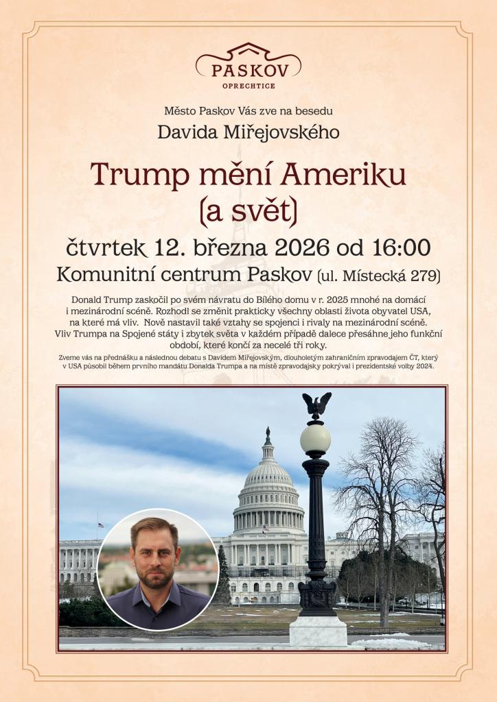 Město Paskov vás zve na přednášku a následnou debatu s Davidem Miřejovským, dlouholetým zahraničním zpravodajem ČT, na téma Trump mění Ameriku (a svět), která se tentokrát uskuteční v Komunitním centru Paskov.
