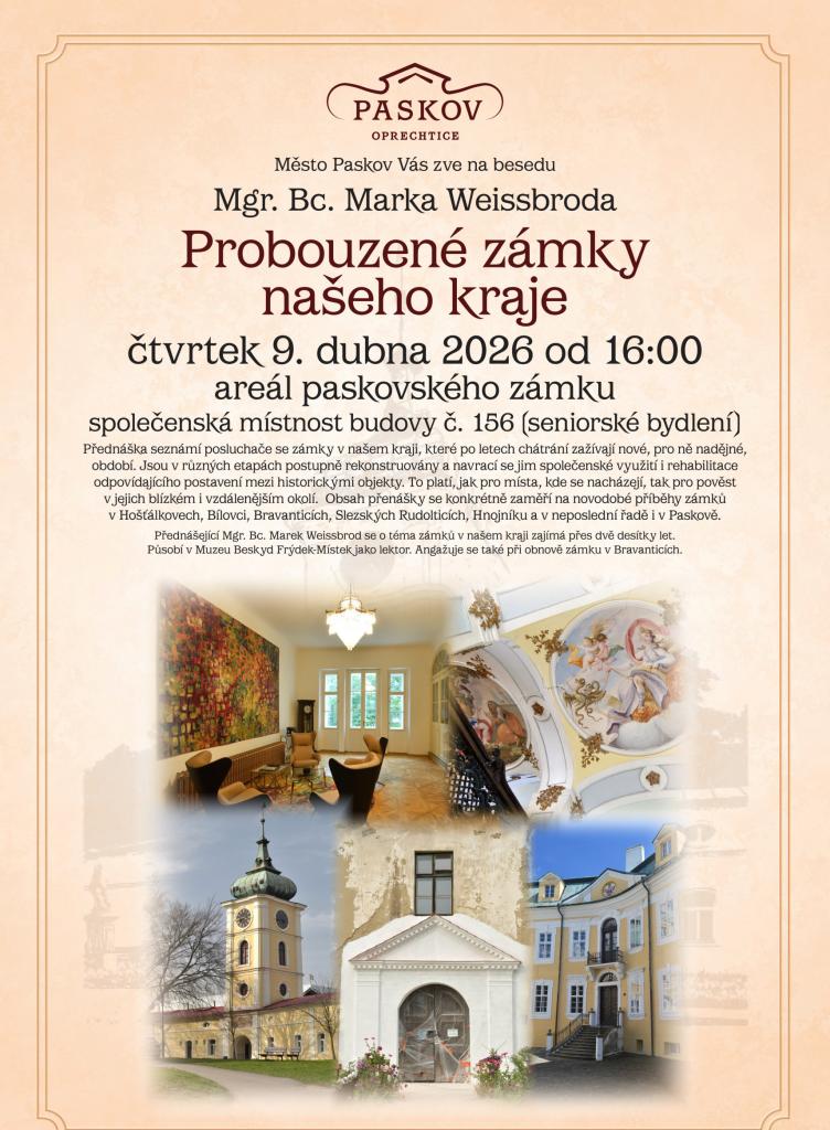 Město Paskov vás zve na besedu Mg. Bc. Marka Weissbroda, která se uskuteční ve čtvrtek 9. dubna od 16 h ve společenské místnosti č.p. 156.